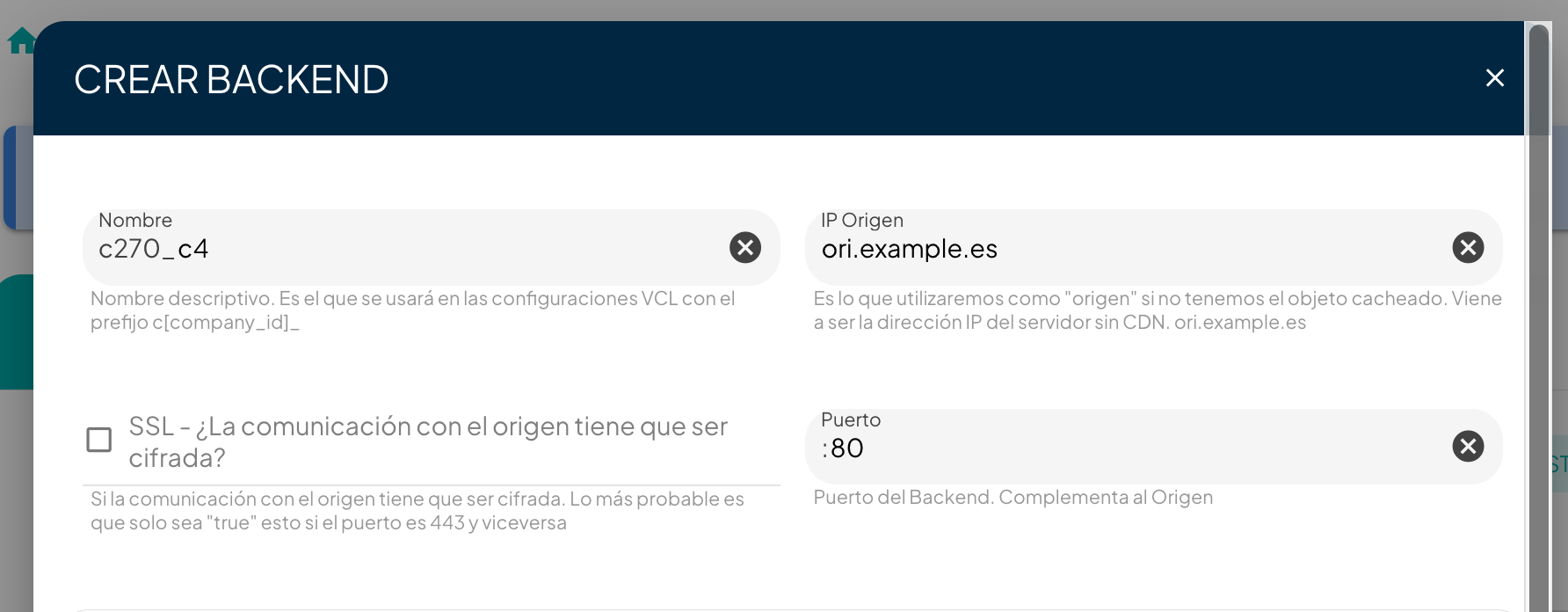 As can be seen, this is just an initial configuration that links the backend `cNNN_example` with the site `www.example.es`. This link can also be made through [**Easy Setup** ](https://docs.transparentedge.eu/getting-started/dashboard/auto-provisioning/configuration)in a simpler way. This allows the CDN to retrieve non-cached resources (MISS).